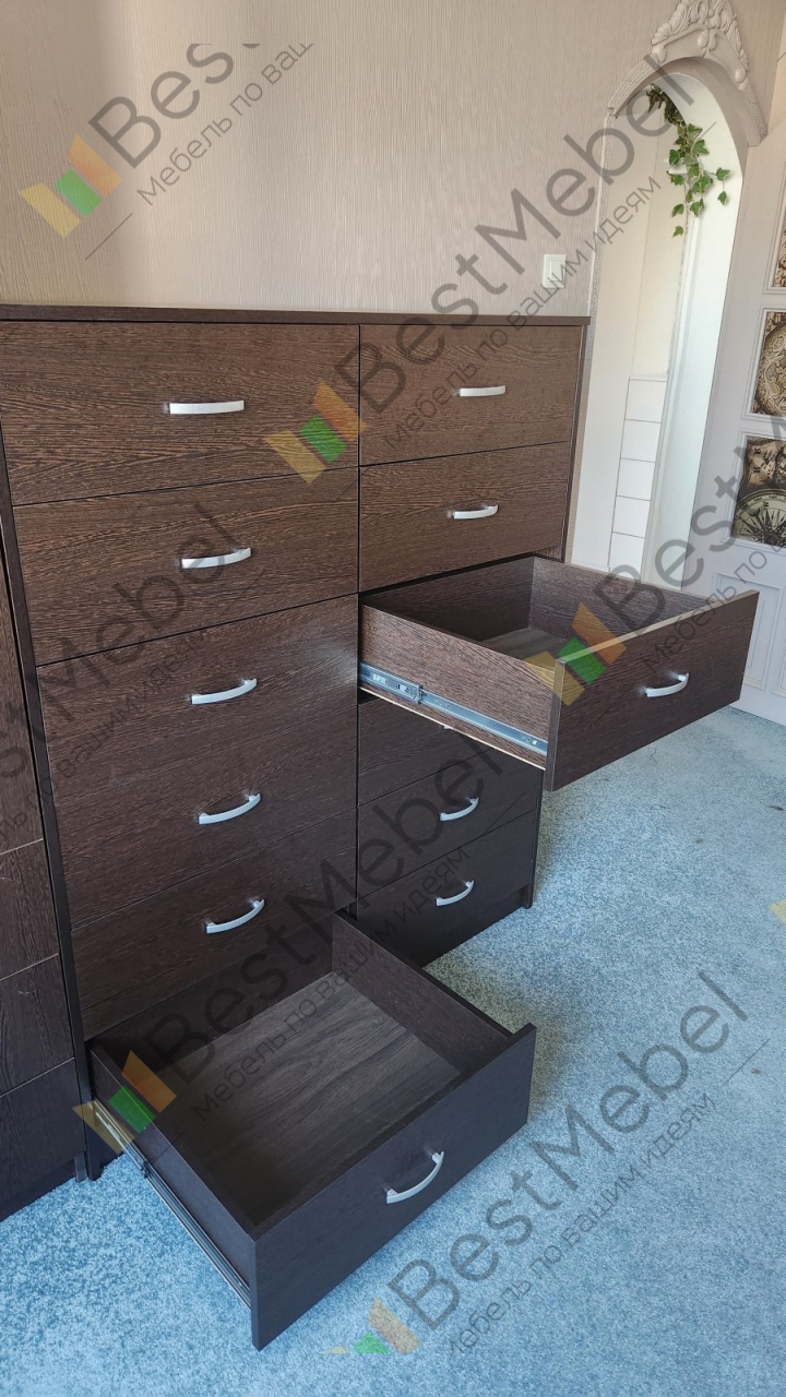 Заказ номер 00000687652. Отличный комод получился. 12 больших и удобных ящиков. И выглядит превосходно - в цвет другой мебели кроме того круто и основательно. Спасибо, сотрудникам магазина, что предложили сделать все ящики двойными - так гораздо лучше и вещи сортировать удобней. Отмечу удивительную скорость производства. Буквально еще пару дней назад согласовал проект - и уже звонят говорят когда доставят. И это уже 6ой элемент мебели который я заказал в этом магазине!