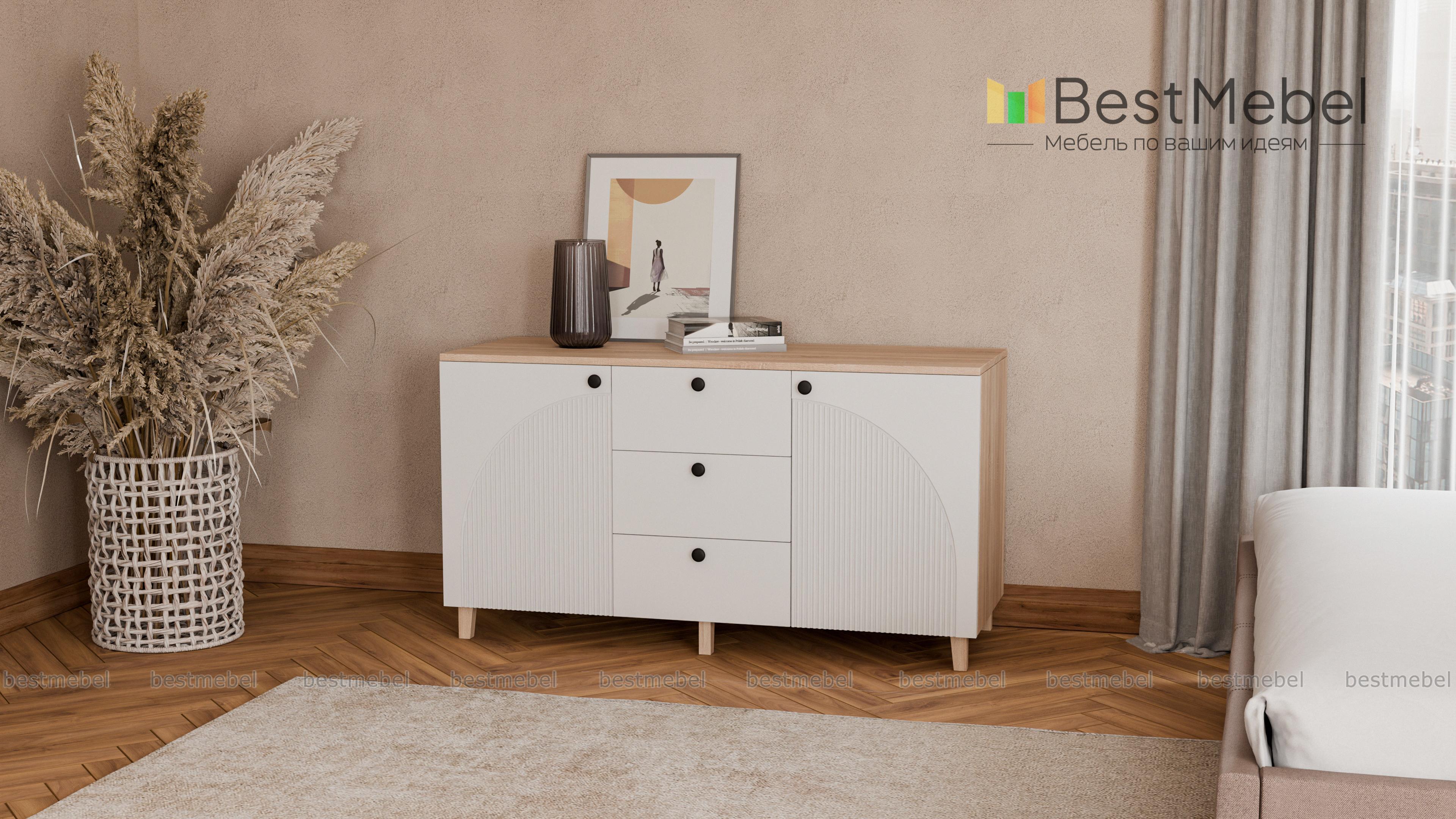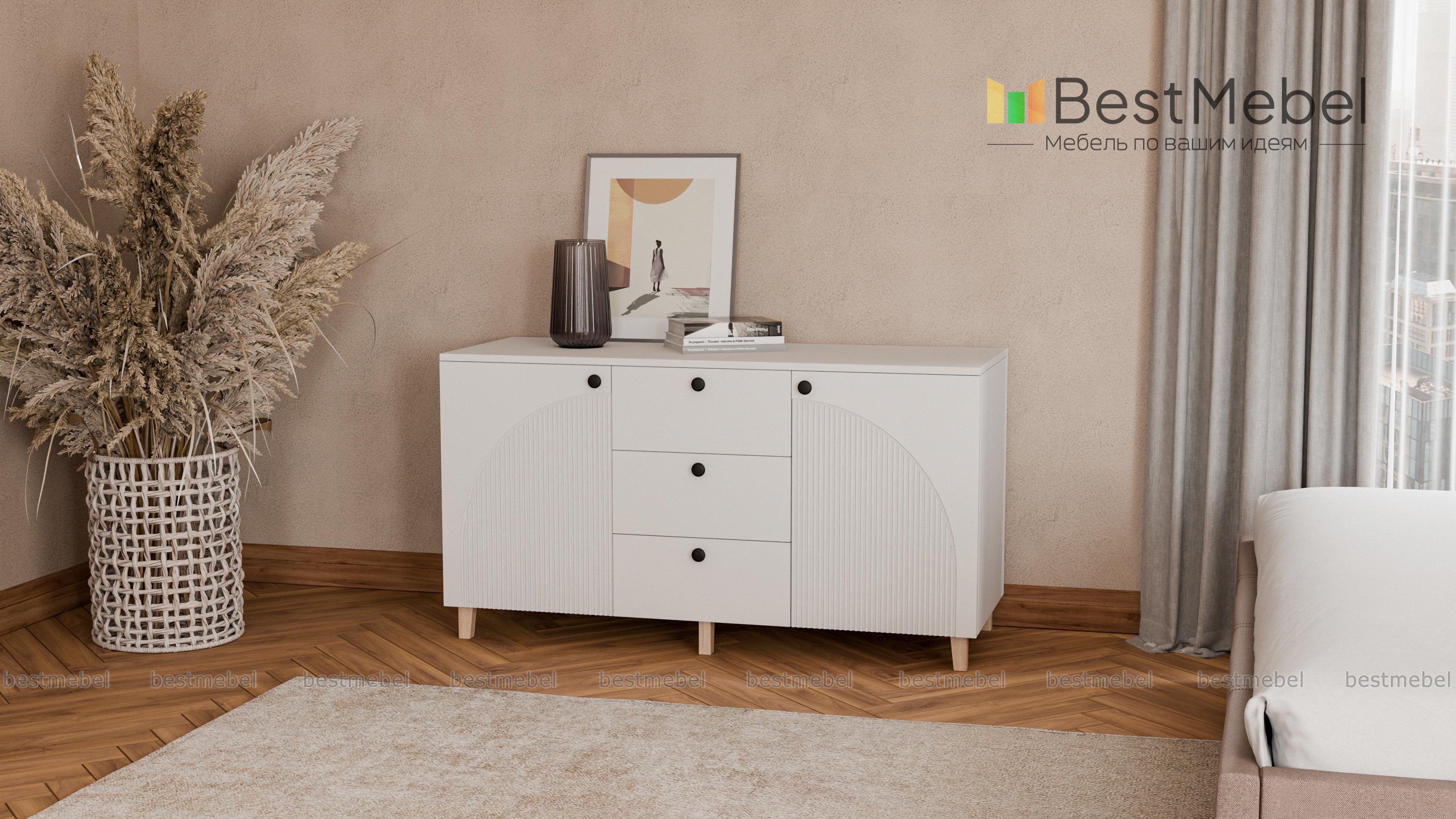 Комод Вивьен 1 BMS — красивый и функциональный, подходит для хранения, размещения техники и декора. Три выдвижных ящика, в которых так удобно хранить мелочи, дополнены просторными распашными секциями по бокам. Широкая конструкция устойчиво располагается на высоких опорах, эстетичный фасад из МДФ украшает оригинальный фрезерованный рисунок. Купить комод Вивьен 1 BMS вы всегда сможете в нашем интернет-магазине, подобрав подходящие именно вам цвета и размеры.