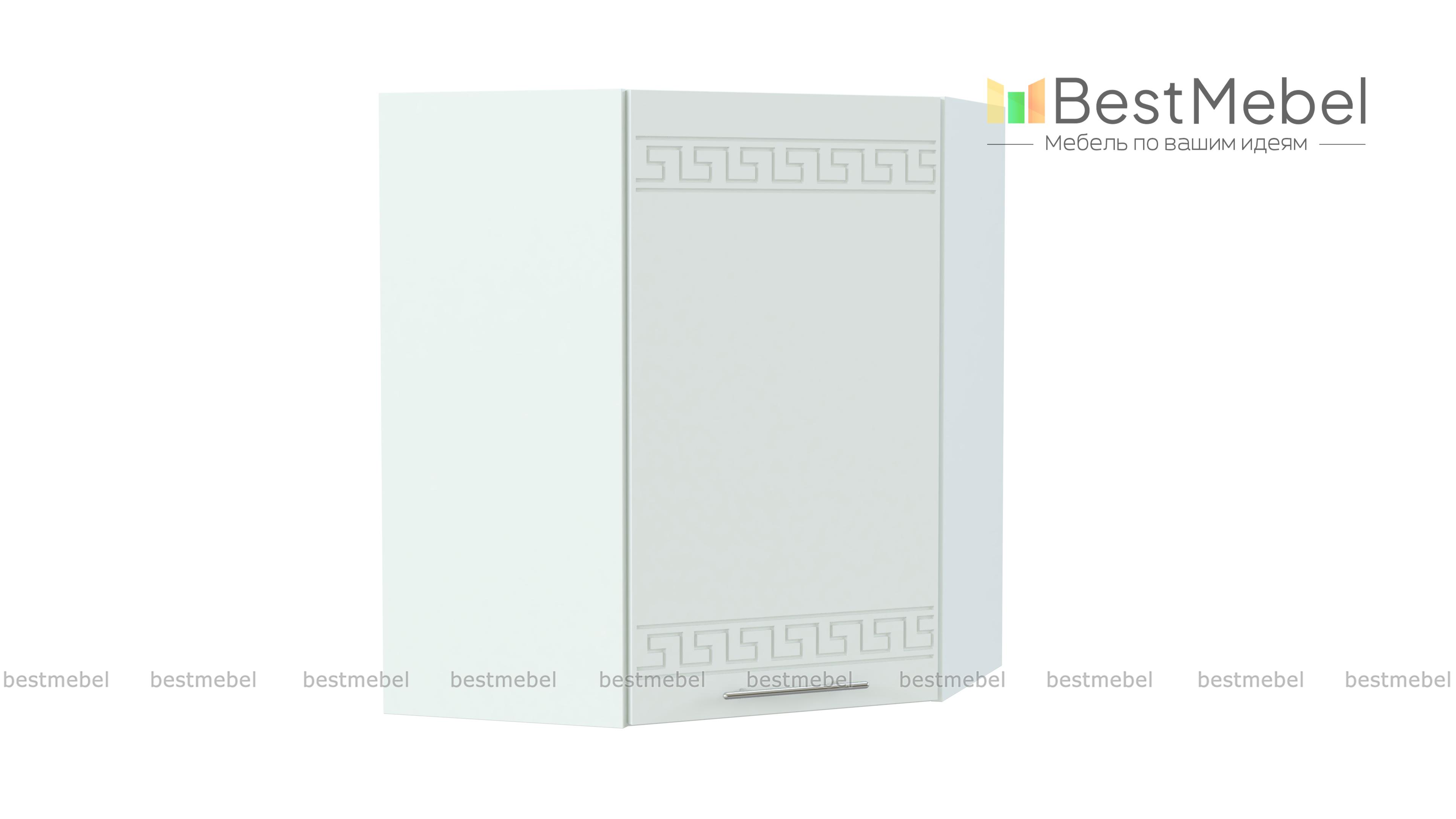 Шкаф навесной угловой 590 Греция BMS незаменим в комплекте Г-образной формы и служит для соединения модулей верхнего ряда. Компактный внешне, шкаф выгодно использует угловое пространство. За глухой распашной дверцей – просторное отделение с полкой для хранения кухонных принадлежностей. Фасад, выполненный в белом матовом оттенке, украшен орнаментом и отличается устойчивостью к влаге, механическим повреждениям и простотой ухода. Купить шкаф навесной угловой 590 Греция BMS по демократичной цене вы сможете в нашем интернет-магазине.