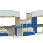 Оригинальная детская двухъярусная кровать ДМ-188 BMS, где интересно решено сочетание зон для отдыха и учебы, элементов под хранение. Здесь 3 спальных места (основание – ЛДСП), расположенных на разных уровнях (два наверху, одно внизу). В центре композиции лестница, где ступени оборудованы ящиками для вещей. Пара столов, разнесенных по разных сторонам, позволит детям заниматься, не мешая друг другу. Обе модели оснащены тумбами, где в ящиках ребенок сможет хранить свои тетради/учебники. В дизайне использовано много полукруглых элементов, что придает изделию необычный вид и дополнительную безопасность. Цветовая гамма подбирается по вкусу и особенностям интерьера комнаты.