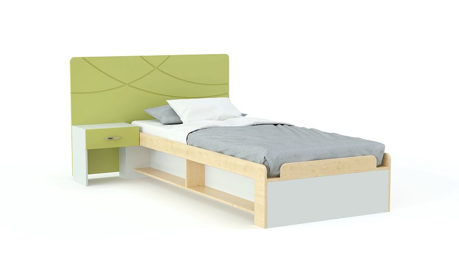Детская кровать F-L-20 BMS изумляет своим лаконичным продуманным дизайном и практичностью! Комфортное спальное место (90 х 190 см) с основанием из ЛДСП оборудовано небольшими бортиками. Высокое изголовье со скругленными углами сделано из МДФ, оснащено маленькой полкой, где ребенок с легкостью расположит нужное. В конструкцию удачно вписана тумба с одним выдвижным ящиком для личных вещей. Сбоку модели две открытые ниши – здесь можно расставить книги. Цветовая гамма фасадов – зеленая, матовая поверхность. Есть другие варианты.