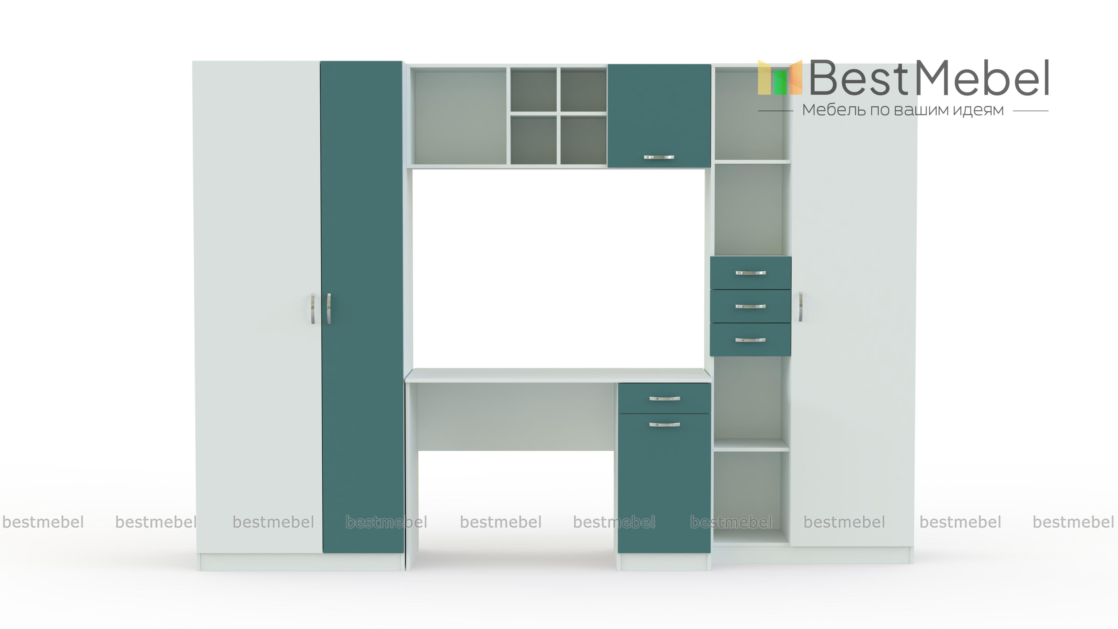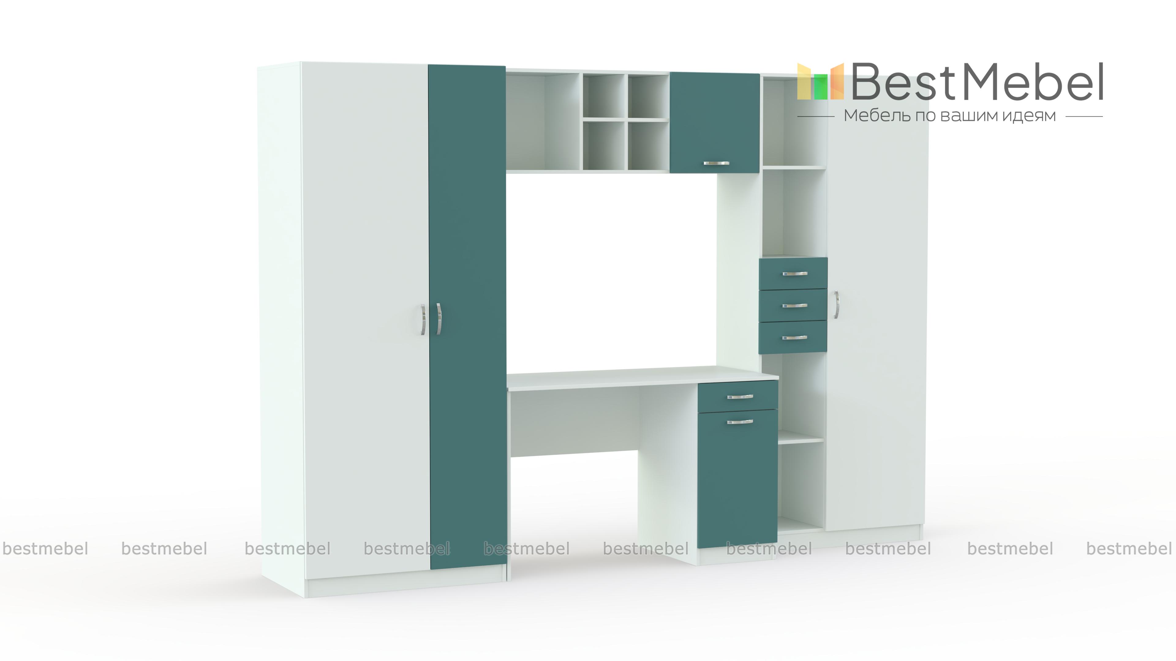 Вместительная и функциональная детская стенка Симба Композиция 1 BMS решит в комнате ребенка проблемы с размещением рабочего места и хранением самых разнообразных вещей. В комплект входят письменный стол с тумбой, комбинированный стеллаж, навесная полка и двухдверный одежный шкаф. Книги, игрушки, школьные принадлежности и предметы гардероба всегда будут в порядке и под рукой. Не оставит равнодушными детей и взрослых и яркая, контрастная расцветка фасадов.