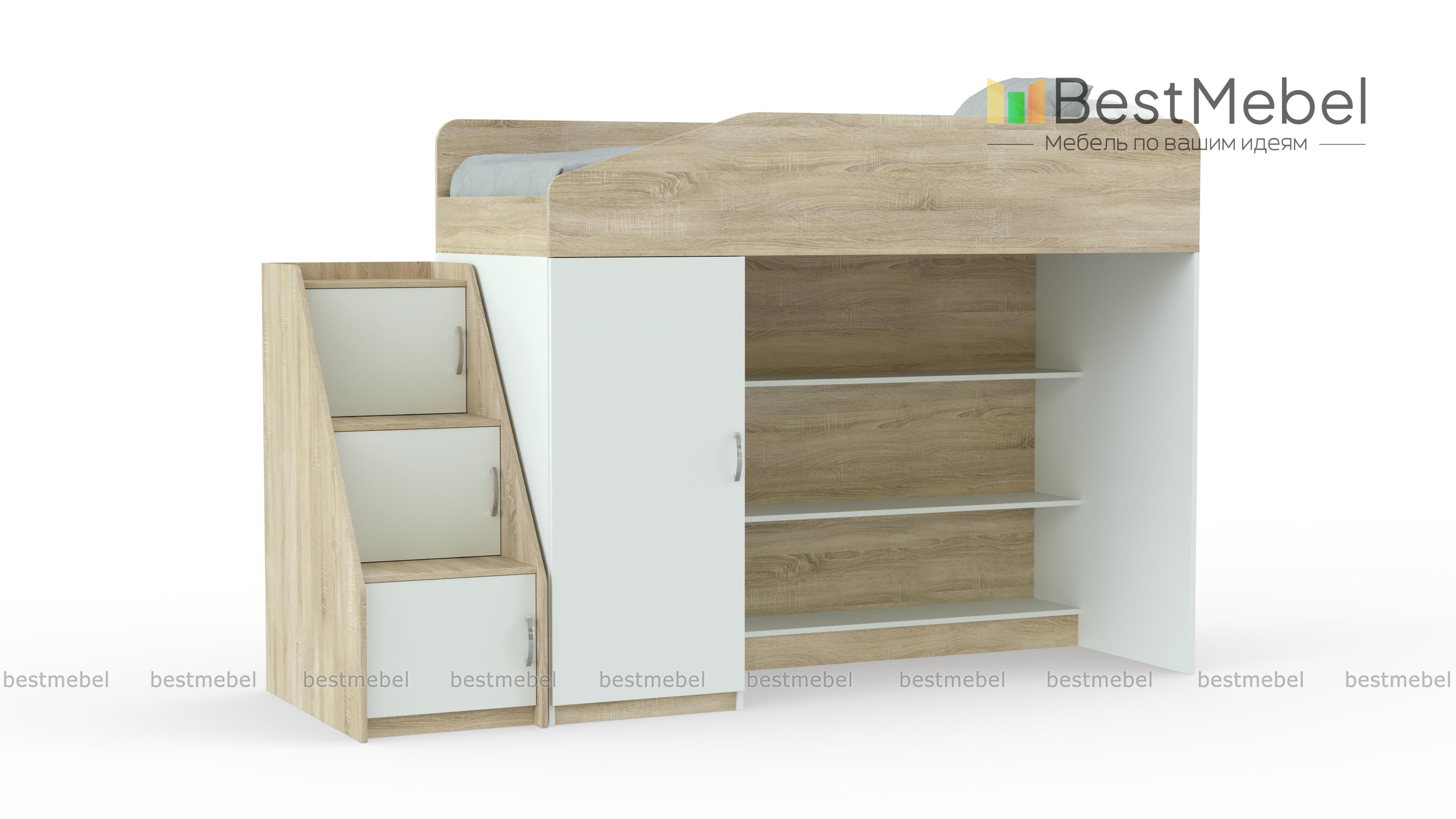 Кровать-чердак Миф-11 BMS отличается комбинированной конструкцией, незаменимой в современной малогабаритной детской. Яркая модель оборудована расположенной на втором ярусе кроватью с защитными бортиками и расположенными на первом распашным шкафом для одежды и просторными полками. Завершает композицию приставная лестница-горка с вместительными ящиками под ступеньками. Скругленные углы обеспечат безопасность пользования, а сочетание древесных тонов и белых элементов создаст позитивную атмосферу. Купить кровать-чердак Миф-11 BMS приглашаем в наш интернет-магазин.