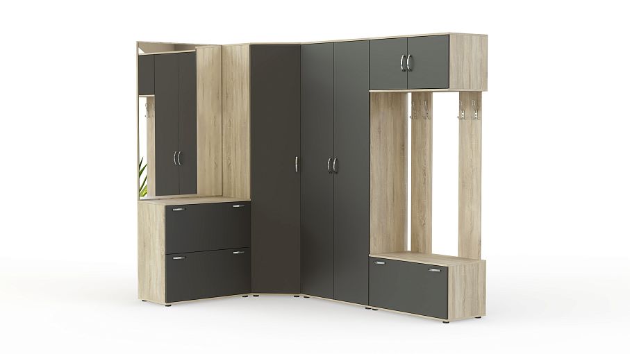 Прихожая Севара 14 BMS отличается практичностью конструкции и нестандартным цветовым решением фасадов, которые превращают модель в центральный предмет интерьера. Выгодно использующая особенности планировки угловая композиция включает в себя шкафную группу с платяным и бельевым отделениями, зеркало с тумбой и открытую вешалку с распашной антресолью и обувницей. Матовые темные фасады не требовательны в уходе и устойчивы к влаге, механическим повреждениям и выгоранию. Купить прихожую Севара 14 BMS приглашаем в наш интернет-магазин.