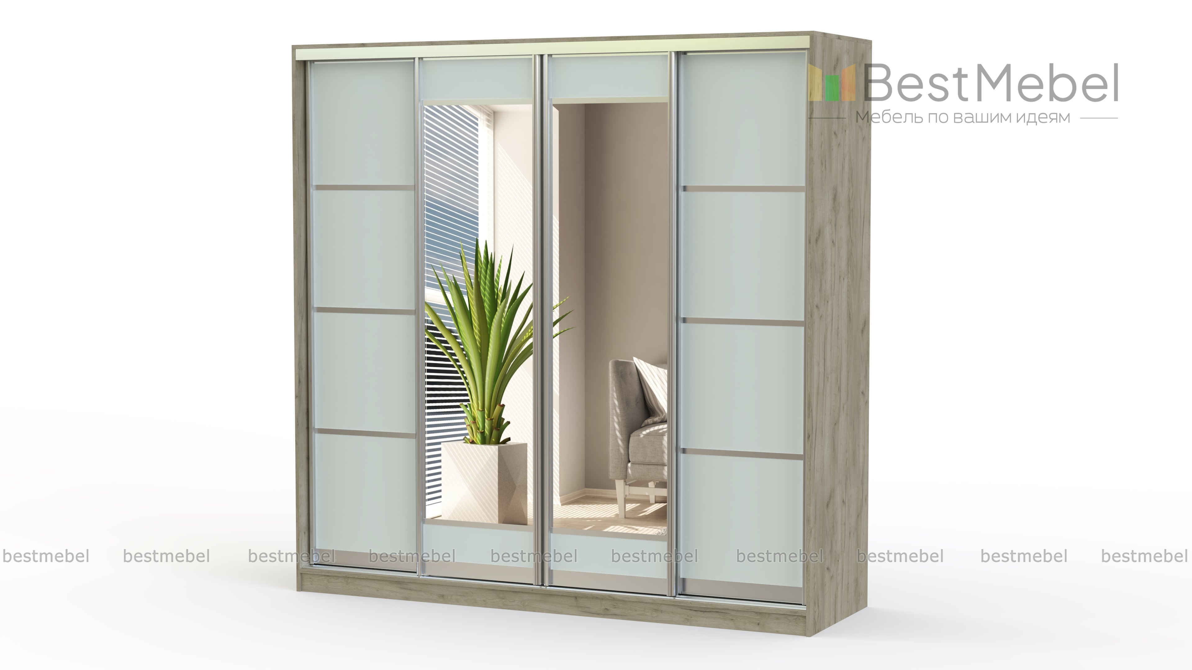 Шкаф-купе Композиция-14 BMS – корпусная мебель, сочетающая в себе привлекательный внешний вид и многофункциональность. Внутреннее наполнение модели состоит из большого количества вместительных полок для хранения одежды и отделения для размещения вешалок. Фасады, разделенные на небольшие квадраты, в сочетании с большими зеркалами удачно впишутся в любой современный интерьер.