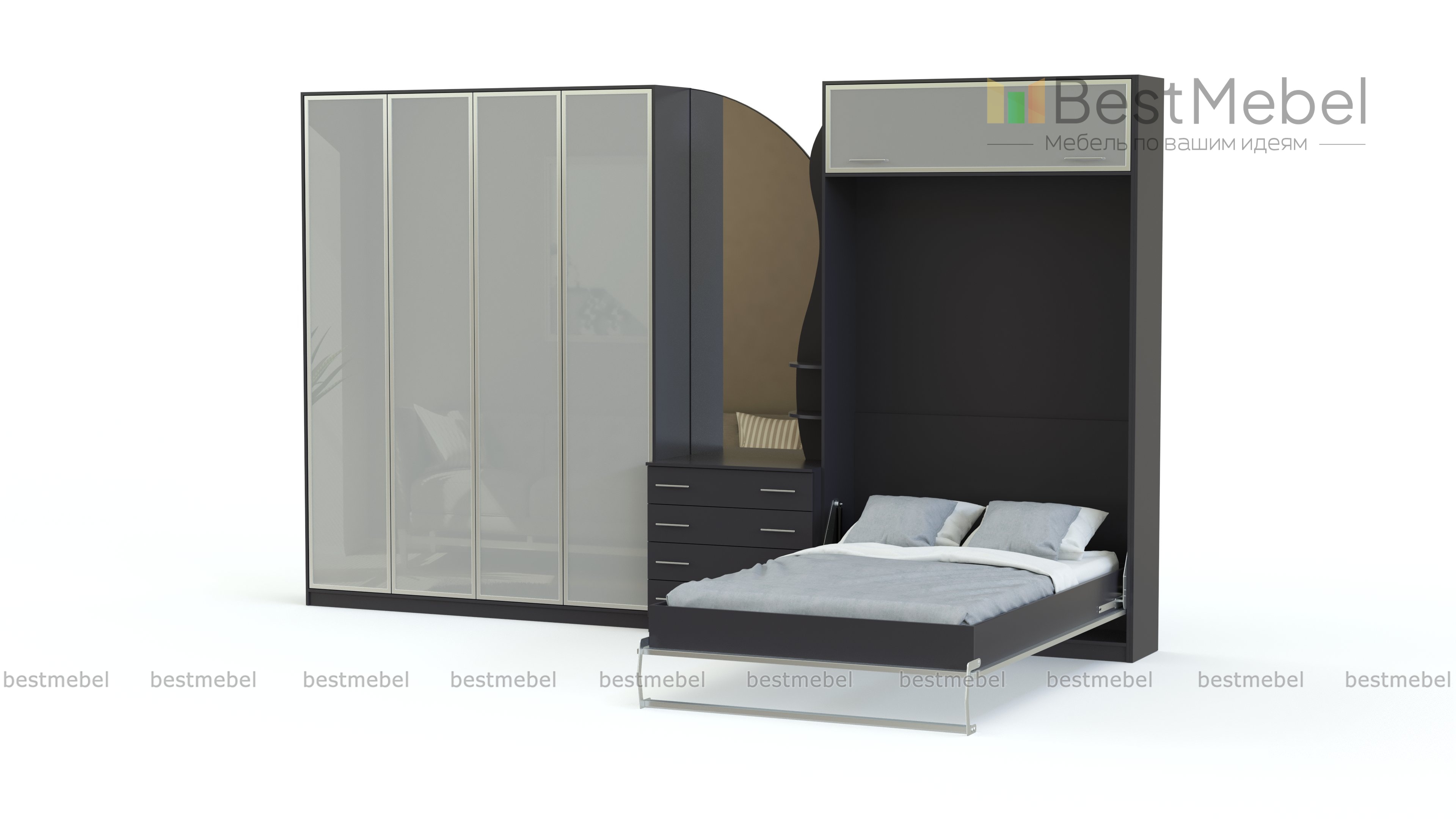 Шкаф-кровать трансформер Фиона 35 BMS позволит легко поменять гостиную зону на спальную. Элегантная современная композиция в насыщенных темных тонах и сером глянце объединила вместительный четырехдверный шкаф для одежды, комод с зеркалом и модуль-трансформер с откидной кроватью, антресолью и торцевыми полочками. Особенность дизайна – фигурно вырезанные элементы и контрастные рамки. Купить шкаф-кровать трансформер Фиона 35 BMS и эффективно использовать пространство вам поможет наш интернет-магазин.
