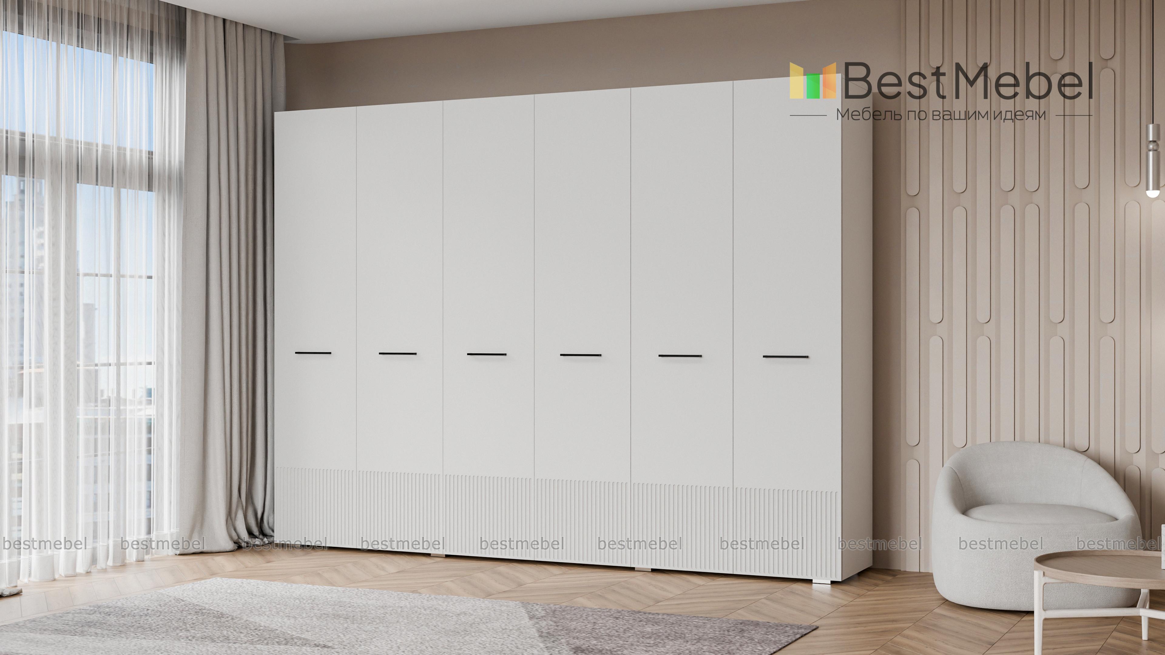 Шкаф распашной Декарт 6 BMS с шестью дверцами создан для хранения в просторных комнатах и обладает отличной вместительностью. Габариты шкафа скрадывает светлый оттенок, фрезеровка в нижней части фасада — практичное и стильное решение. Порядок в вашем гардеробе помогут легко поддерживать две центральные штанги и вместительные бельевые полки по бокам. Купить шкаф распашной Декарт 6 BMS, изготовленный по вашим размерам, приглашаем на сайт нашего интернет-магазина.