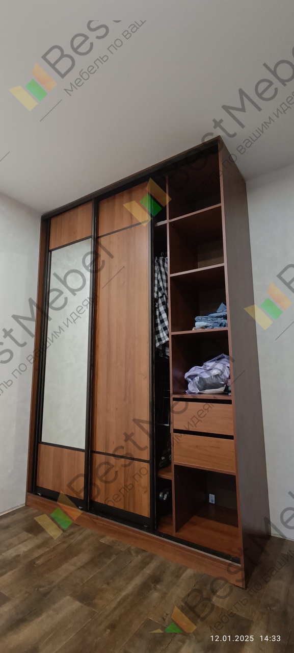 Заказ 00000927476 Шкаф-купе В-11 BMS (1800х2570х600) (Белье - Платяной отсек - Белье (4 ящика) (3)).Сделали заказ через сайт магазина, выбрали внешний вид шкафа, размеры которые нам были нужны(прописали в ручную, не стандартные шаблоны, а именно то, что нужно было нам), выбрали из предложенных вариантов наполнение шкафа, цвет и доп.аксессуары. Сделали заказ, на следующий день с нами связалась менеджер магазина и уточнила детали заказа, скорректировали заказ, и через несколько дней нам привезли шкаф. Собирали сами, все отверстия намечены, схему сборки приложили, все детали подписаны. Качество материалов хорошее, за приемлемую цены мы получили шкаф который хотели. Теперь стоит и на отведенном для него месте и радует своим функционалом.