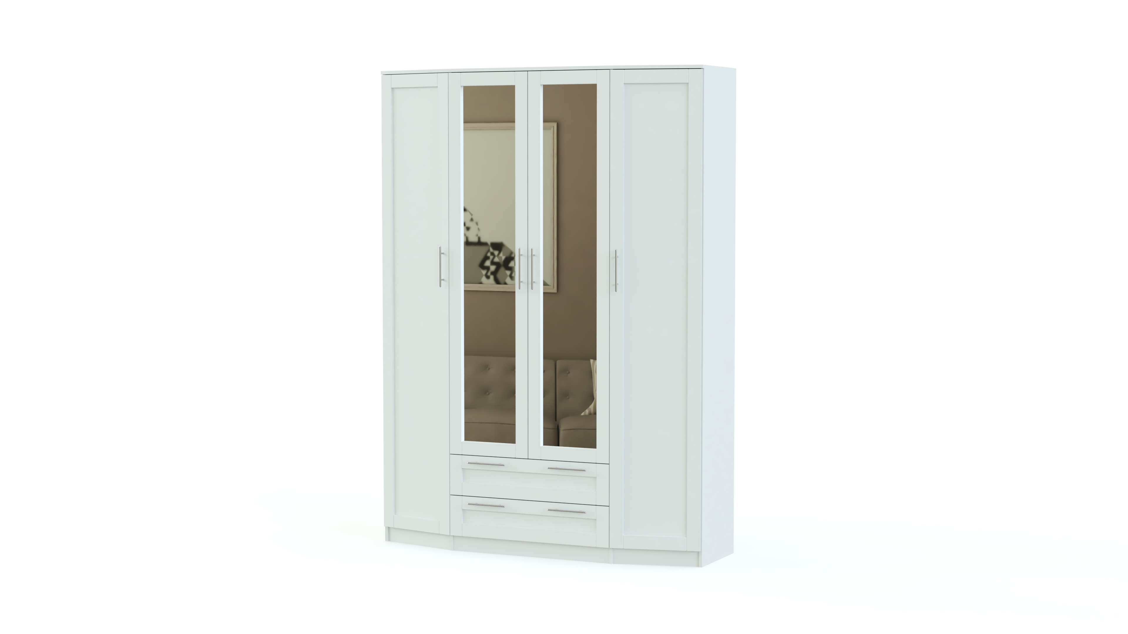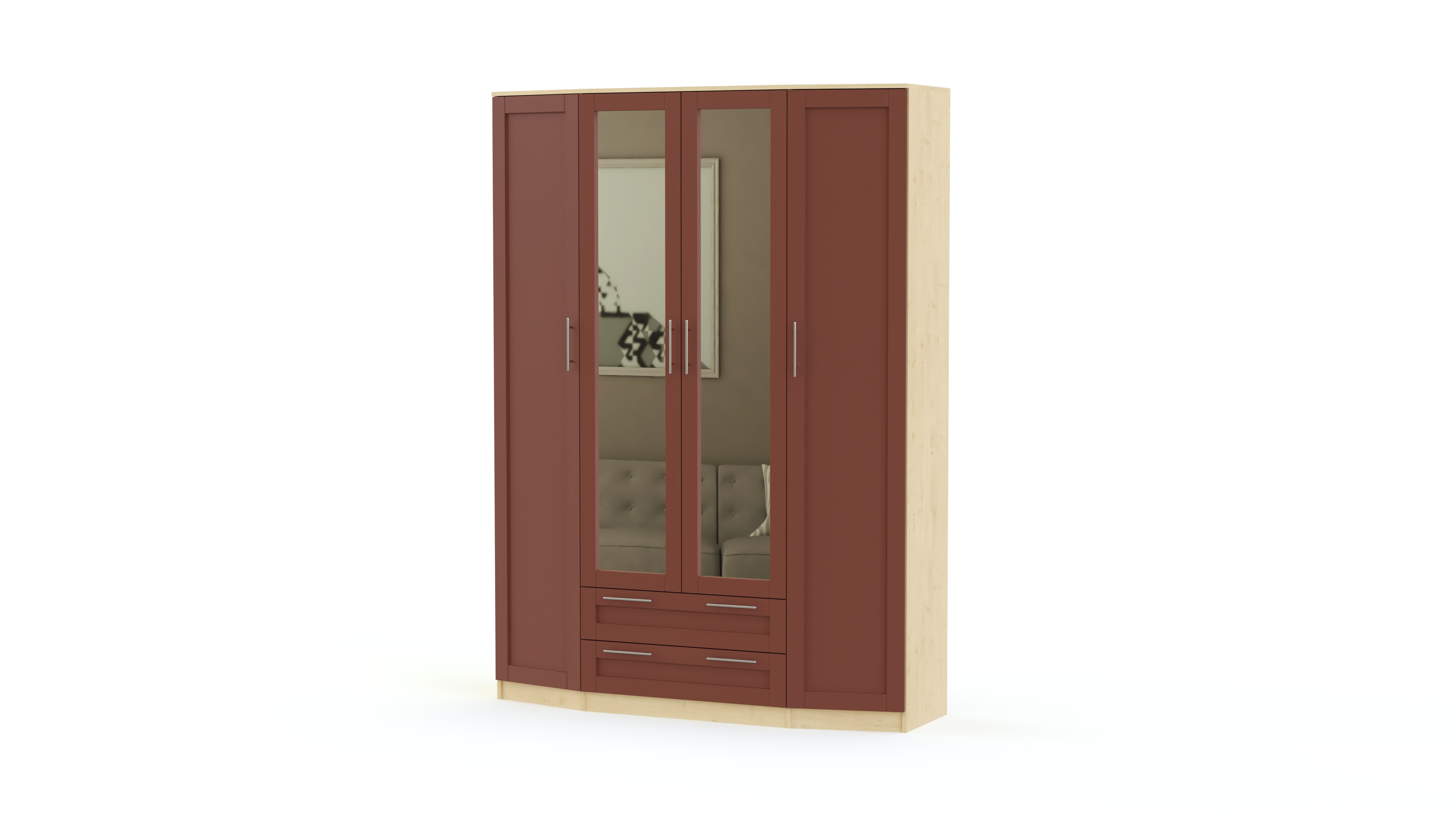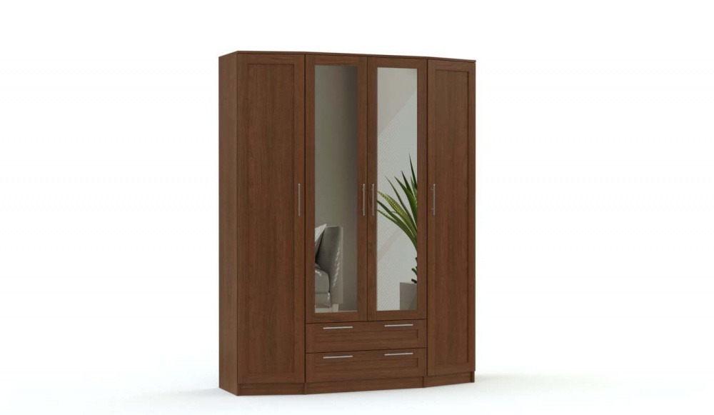 Стильная спальня Скандинавия BMS будет одинаково хорошо смотреться в современном помещении и комнате классического стиля. В ее оформлении удачно сочетаются простые формы, функциональность и интересный декор фасадов естественных древесных оттенков. В комплект входит состоящий из центрального с зеркалами и двух боковых скошенных элементов вместительный шкаф, удобный комод с навесным зеркалом, двуспальная кровать и две тумбы. Особенно выгодной покупка этого гарнитура будет в нашем интернет – магазине.