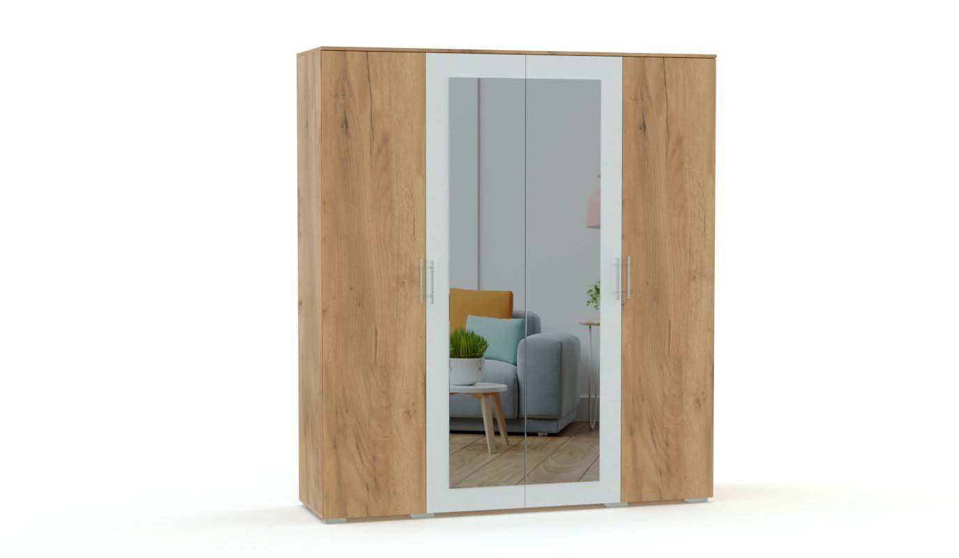 Минималистичный, и, в то же время, очень уютный и стильный комплект для спальни. В него входят двуспальная комфортная кровать с тумбочками и шкаф с оригинальными распашными дверцами, образующими в центральной части сплошное зеркальное полотно. Удобная система хранения из штанги и набора полок обеспечивает отличную вместительность, а тумбочки пригодятся для необходимых мелочей. Для оформления фасадов вы можете выбрать яркий или спокойный оттенок.