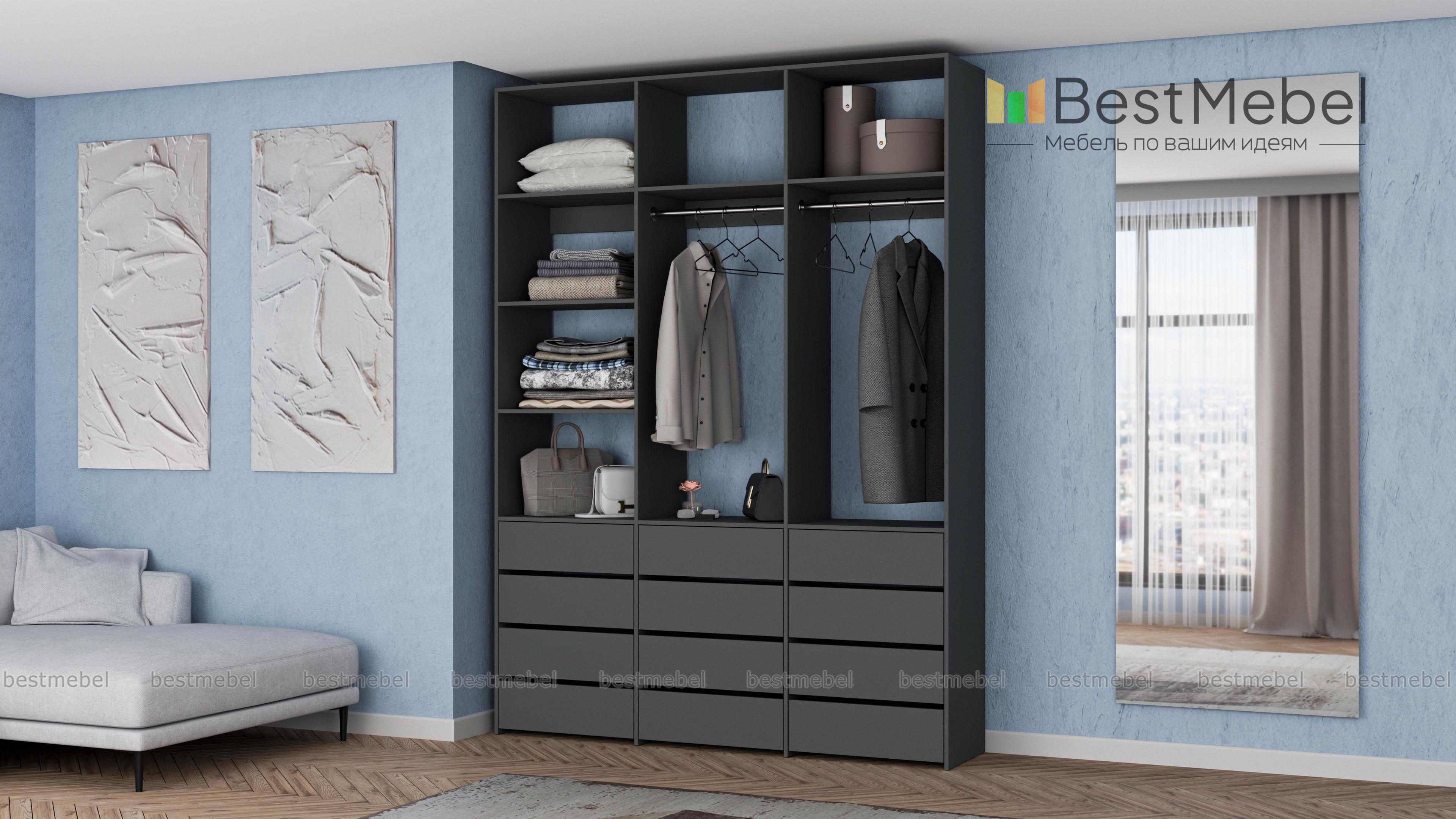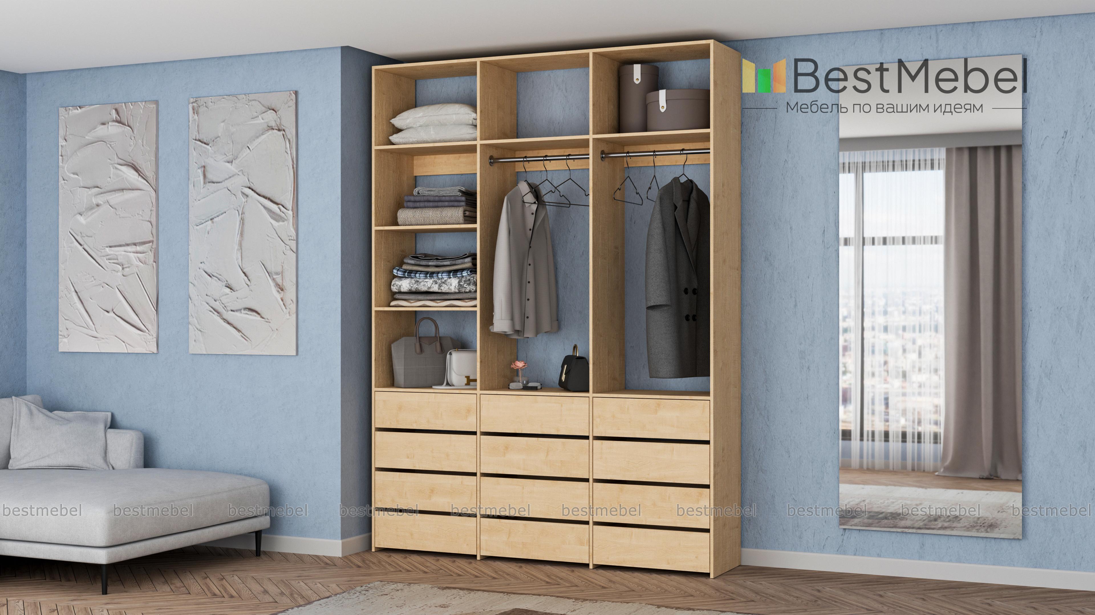 Стеллаж для одежды Мирта 48 BMS имеет минималистичный и функциональный дизайн. Трехсекционная конструкция включает в себя штанги для вешалок с одеждой, выдвижные ящики для белья и верхние полки, отделение слева для удобства также разделено двумя полками. Материал изготовления — прочная и долговечная ламинированная плита. Купить стеллаж для одежды Мирта 48 BMS, выполненный по индивидуальным размерам, вы сможете недорого на сайте нашего интернет-магазина.