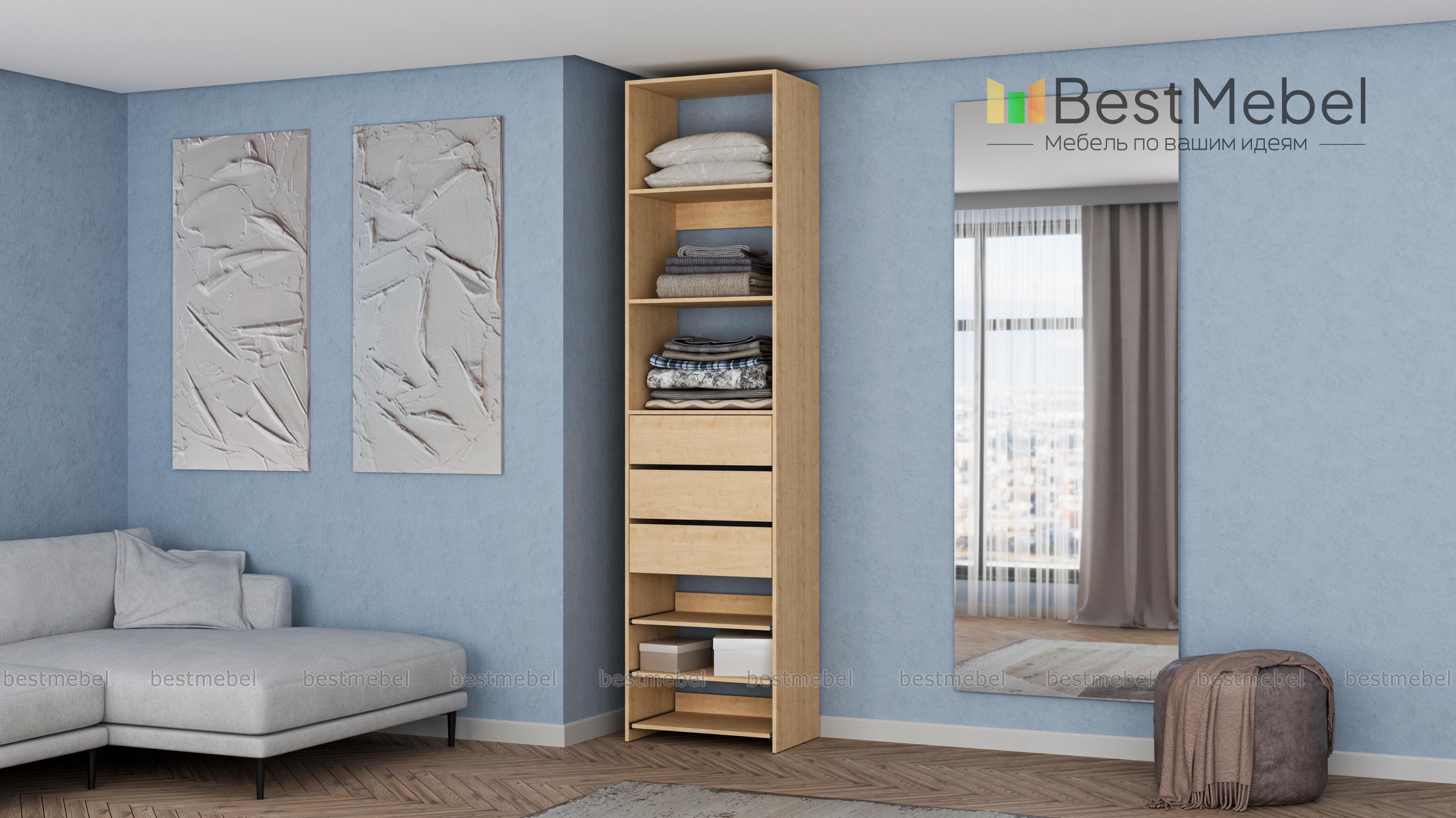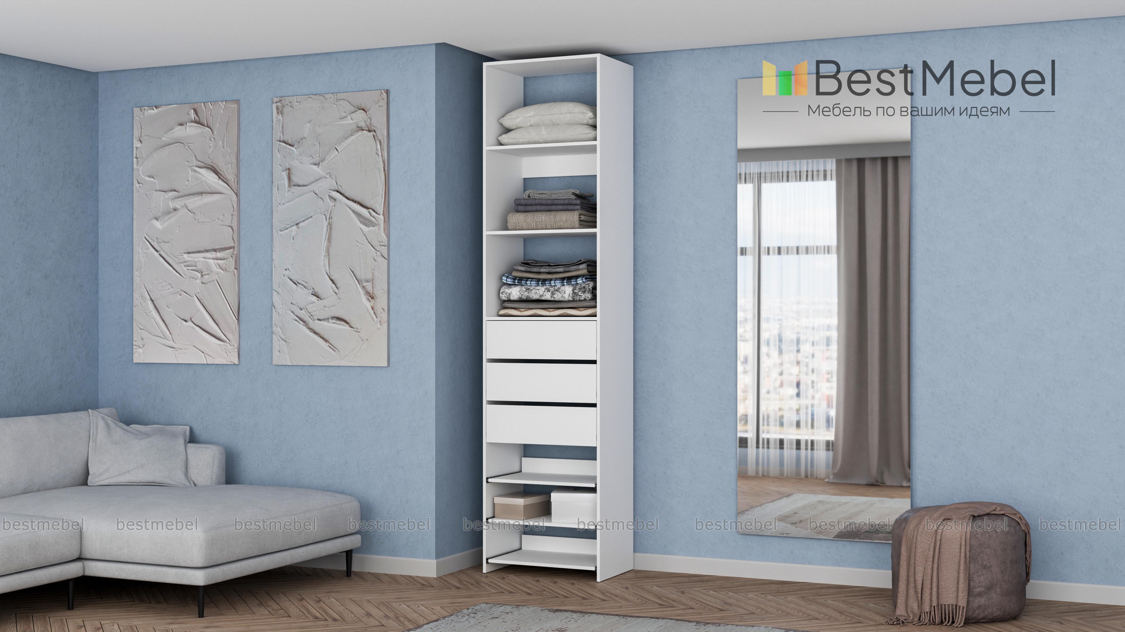Стеллаж для одежды Мирта 77 BMS дополнит гардеробную систему или станет самостоятельным предметом меблировки. Односекционная модель оборудована тремя ящиками, стационарными и выдвигающимися полками для хранения одежды в сложенном виде, мелкого трикотажа, обуви и аксессуаров. Ламинированные поверхности влагостойкие и не требуют сложного ухода. Купить стеллаж для одежды Мирта 77 BMS, подобрав размеры и цвет под свой интерьер, можно на сайте нашего интернет-магазина.