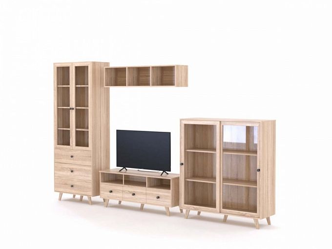 Стенка Марта BMS гармонично сочетает минималистичный дизайн и цветовое решение в натуральных оттенках под древесный массив. Оборудовать уютную гостиную с элементами скандинавского стиля помогут вам широкая низкая тумба под ТВ с ящиками и нишами, навесная открытая полка для книг и декоративных мелочей, комбинированный шкаф с застекленными дверцами и тумба-витрина. Благодаря высоким ножкам предметы не смотрятся громоздко и облегчают интерьер. Купить стенку Марта BMS вы сможете в нашем интернет-магазине.