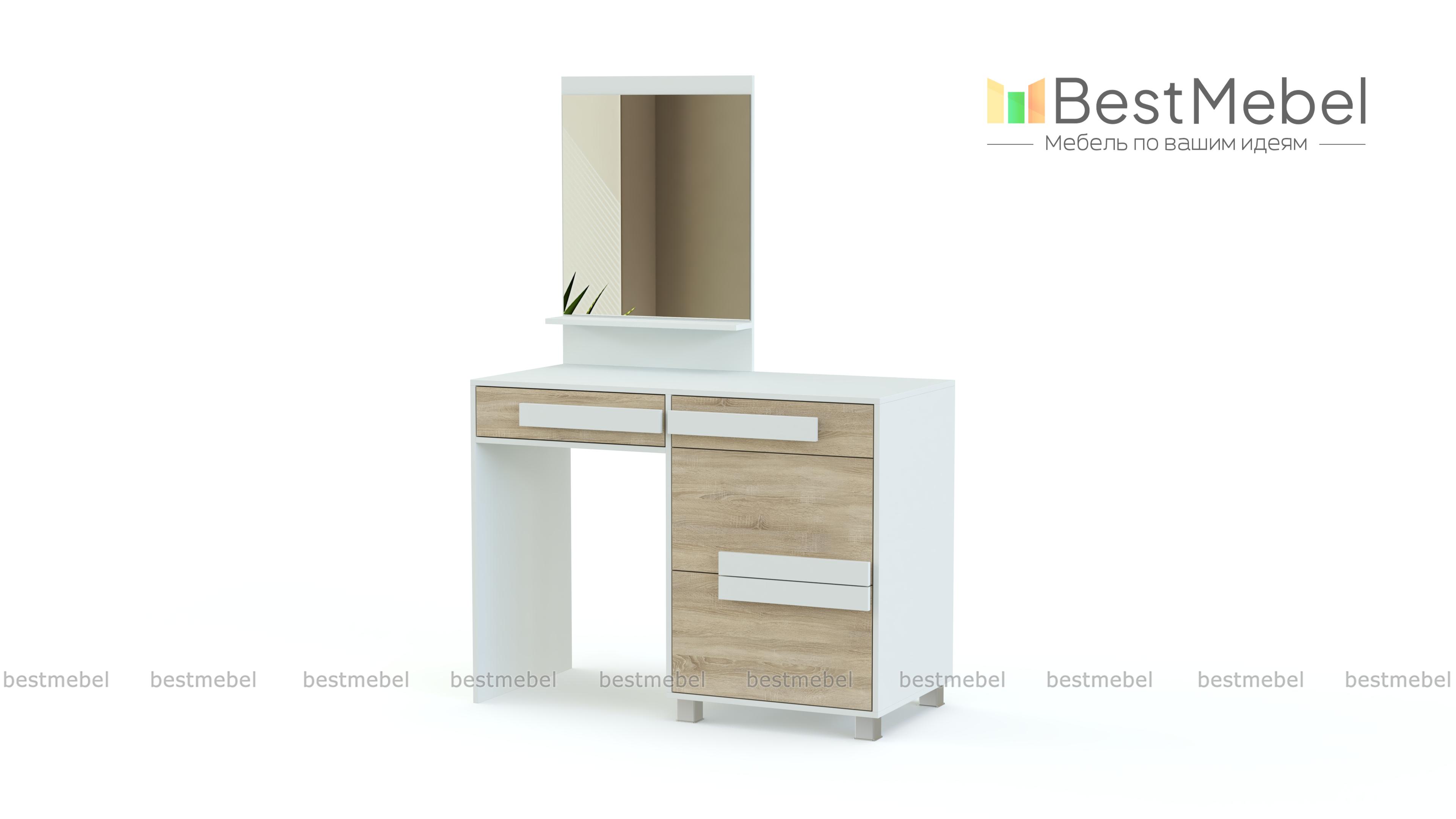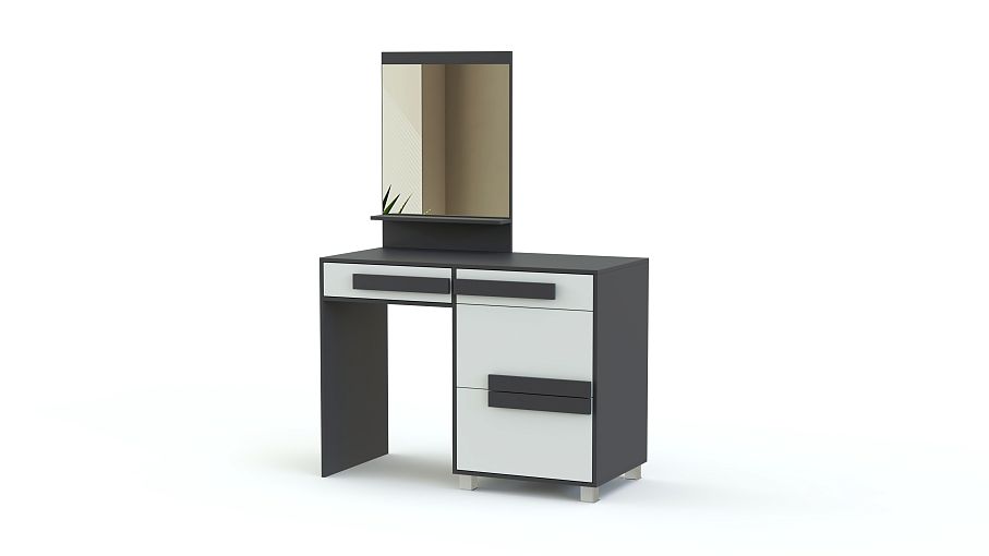 Туалетный столик СТ-5 Арт 155 BMS – стильный предмет интерьера для современной спальни. Закрепленное на столешнице зеркало дополнено узкой полочкой для мелочей. Также модель оснащена выдвижным ящиком и боковой тумбой для хранения уходовых средств и бумаг. Интересно смотрится этот простой функциональный столик за счет необычной отделки фасадов, модной цветовой гаммы и высоких ножек тумбы. Доступный по цене, туалетный столик СТ-5 Арт 155 BMS будет отличным приобретением для дополнения спального гарнитура или установки в прихожей.