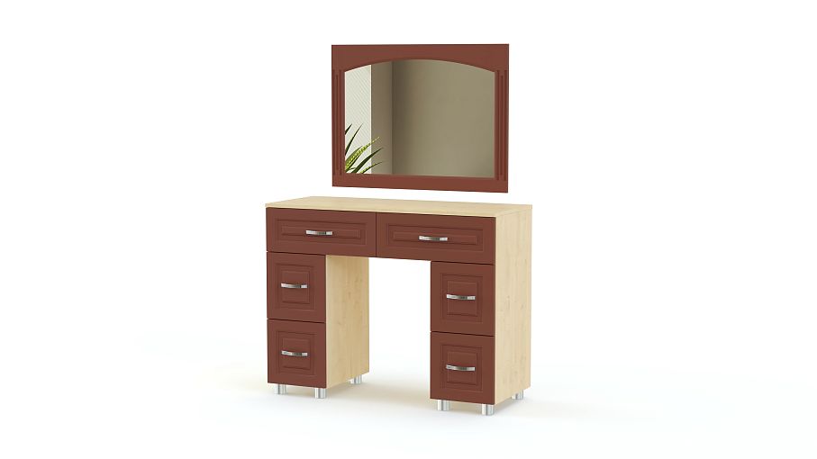 Туалетный стол Элизабет 3 BMS поможет вам разместить под рукой все необходимые уходовые средства и аксессуары. Двухтумбовая модель оборудована широкой столешницей, двумя большими и четырьмя малыми выдвижными ящиками, а дополняет композицию навесное зеркало в раме. Столик выполнен в теплых терракотовых тонах и декорирован по фасаду рамочной фрезеровкой. Купить туалетный стол Элизабет 3 BMS вы сможете на сайте нашего интернет-магазина.