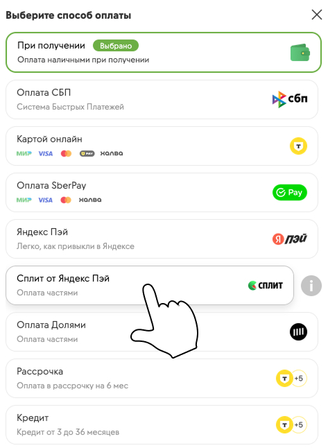 Чтобы оплатить заказ по частям, необходимо при оформлении заказа указать способ оплаты "Яндекс Сплит". Далее на странице подтверждения выберите пункт "Оплатить".